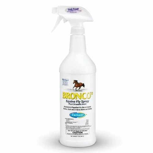 Farnam Bronco® Equine Fly Spray Plus Citronella Scent is water-based and ready-to-use. The pyrethrin and permethrin formula is economical, yet effective. Repels and kills house flies, horn flies, stable flies, deer flies and horse flies, also mosquitoes, lice and gnats. Formulated for better penetration of hair coat. Also kills fleas and ticks on dogs.