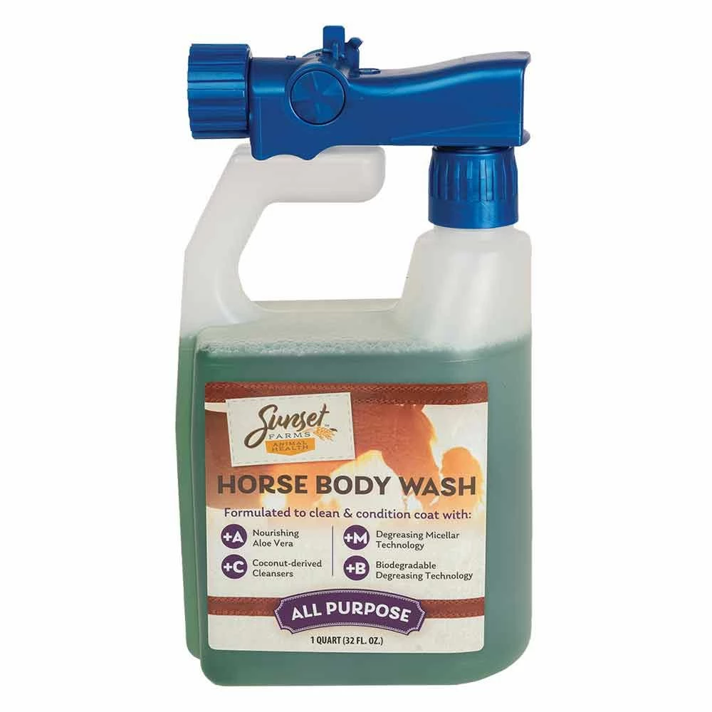 Sunset Farms Horse Body Wash begins to loosen and lift away dirt as soon as it's sprayed on your animals – no scrubbing required!. The environmentally friendly formula is safe for their skin but tough on soil.