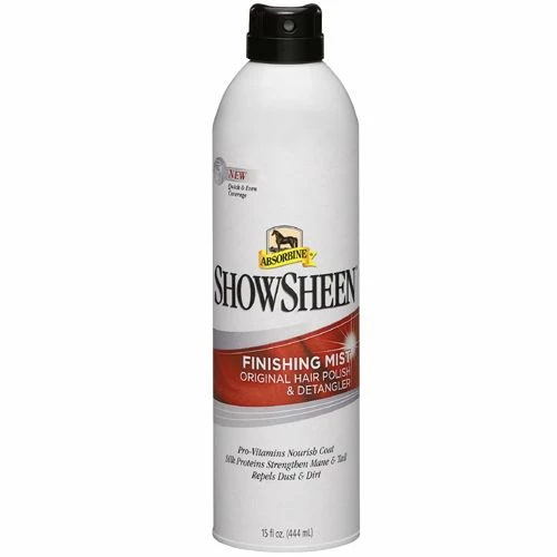 Absorbine® ShowSheen® Finishing Mist is perfect for last-minute touch-ups. ShowSheen Finishing Mist has a continuous, quiet sprayer that won't spook your horse and even sprays upside down. It is enriched with pro-vitamins to nourish the coat for a world-class shine. New silk proteins strengthen mane and tail hair for a more beautiful appearance. Fresh scents of jasmine and sandalwood pamper your horse.