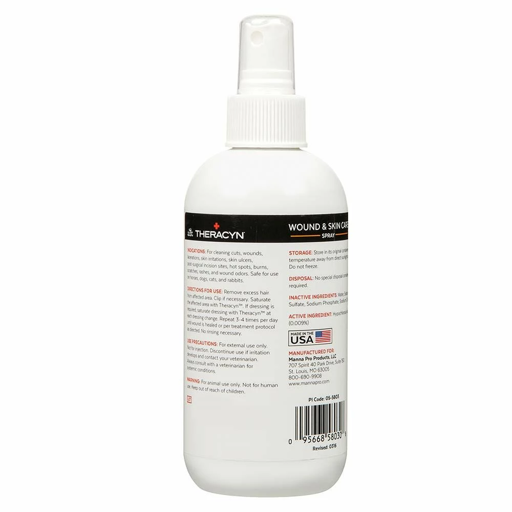 | Directions For Use | Remove excess hair from affected area. Saturate the affected area with Theracynβ’. If dressing is required, saturate dressing with Theracyn at each change. Repeat 2-4 times per day until wound is healed or directed by the vet. No rinsing necessary. |