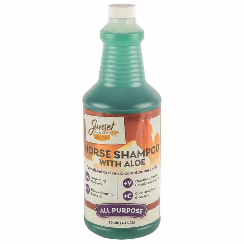Sunset Farms Horse Shampoo with Aloe removes greasy buildup and strips your horse's mane and tail of silicone-based detanglers. The environmentally friendly formula is safe for their skin but though on soil.