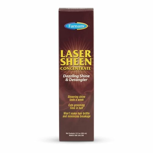 Farnam Laser Sheen Dazzling Shine and Detangler Concentrate mixes with water to create the same powerful luster and soft manageable manes and tails. The show-stopping, high gloss formula produces a radiant shine. Good for detangling manes and tails, leaving them shinier and more manageable.