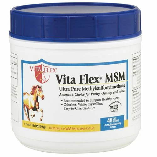 Vita Flex MSM Joint Health is recommended for the support of healthy joint. It is odorless, white crystalline easy-to-give granules. It is ultra pure methylsulfonylmethane, a naturally occurring source of bioavailable sulfur, an essential mineral for both large and small animals. MSM is a form of organic sulfur found in all living organisms and is the primary metabolite of DMSO (dimethylsulfoxide). Since 1988, horsemen and pet owners have relied on the quality and value of Vita Flex® MSM to deliver the benefits of this unique ingredients.