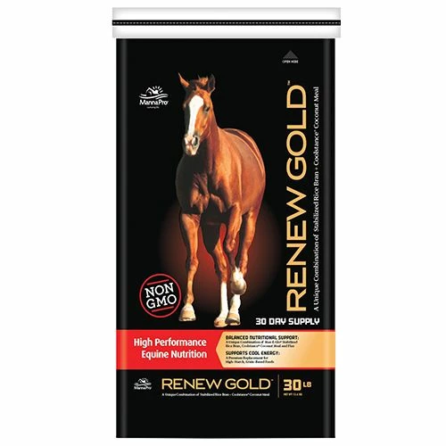 Renew Gold™ gives horse owners the opportunity to utilize the nutritional advantages of Stabilized Rice Bran in an even more effective, advanced formulation. The unique combination of stabilized rice bran with CoolStance® Coconut Meal, Flax, and Fermented Yeast Culture allows Renew Gold to provide concentrated nutritional support for horses of all types and disciplines! Renew Gold™ – Combines stabilized rice brand with conconut meal and flax for balanced nutritional support.