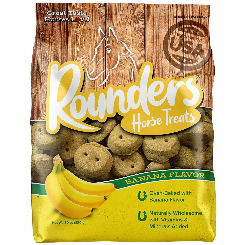 Banana Flavored Rounders are an all-natural horse treat, fortified with vitamins and minerals. Banana Flavored Rounders are made with the highly palatable banana flavor that horses simply can’t resist.